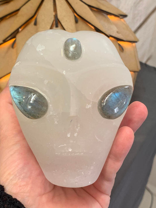 Crâne de cristal galactique en sélénite et oeil de tigre