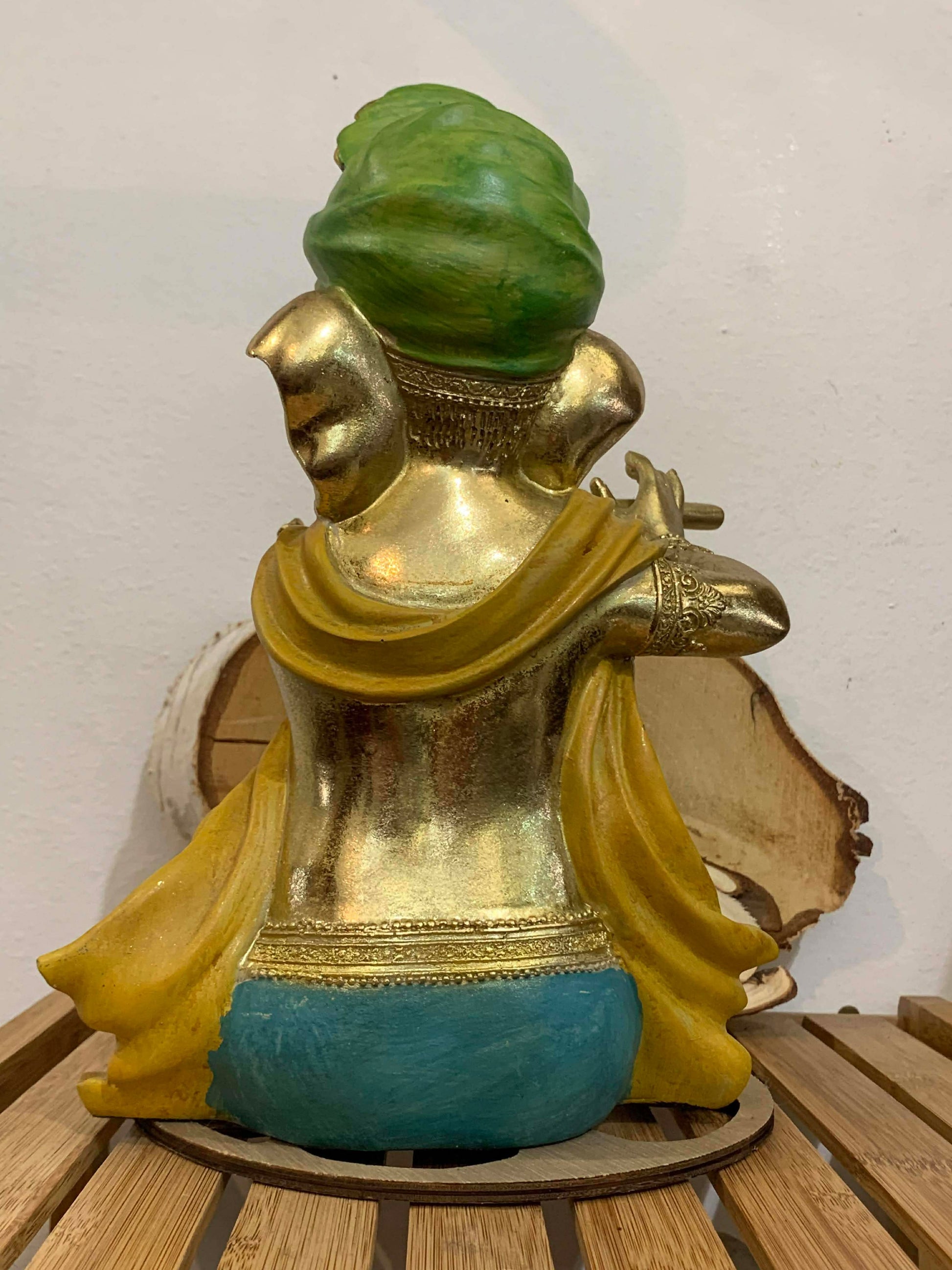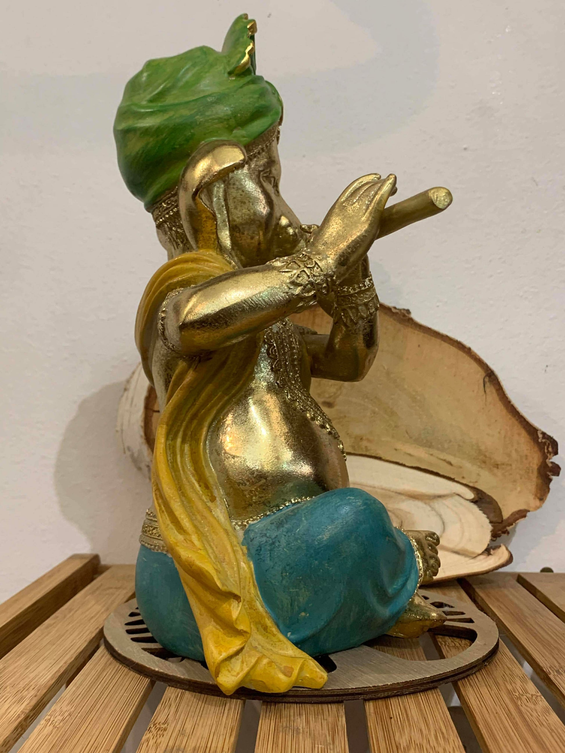 Cette statue de Ganesh représente une dimension profondément spirituelle et symbolique du dieu à tête d’éléphant, ici montré assis, détendu, jouant de la flûte, ce qui est une iconographie plus rare. Ganesh est avant tout le dissipateur des obstacles, celui qui ouvre les chemins matériels et intérieurs ; sa posture assise évoque la stabilité, l’ancrage et la sagesse tranquille. Le fait qu’il joue de la flûte renforce une lecture spirituelle subtile : la flûte symbolise le souffle divin qui circule librement lorsque l’ego se fait silencieux, invitant à l’harmonie intérieure, à l’écoute du cœur et à la joie simple. Son ventre rond est signe d’abondance et de capacité à accueillir les expériences de la vie sans résistance. Les couleurs dorées renvoient à la connaissance spirituelle et à la prospérité, tandis que le vert et le bleu évoquent la guérison, la croissance et la paix émotionnelle. Dans son ensemble, cette statue transmet un message de chemin spirituel sans lutte, où les obstacles se dissolvent par la conscience, la douceur et l’alignement intérieur plutôt que par la force.