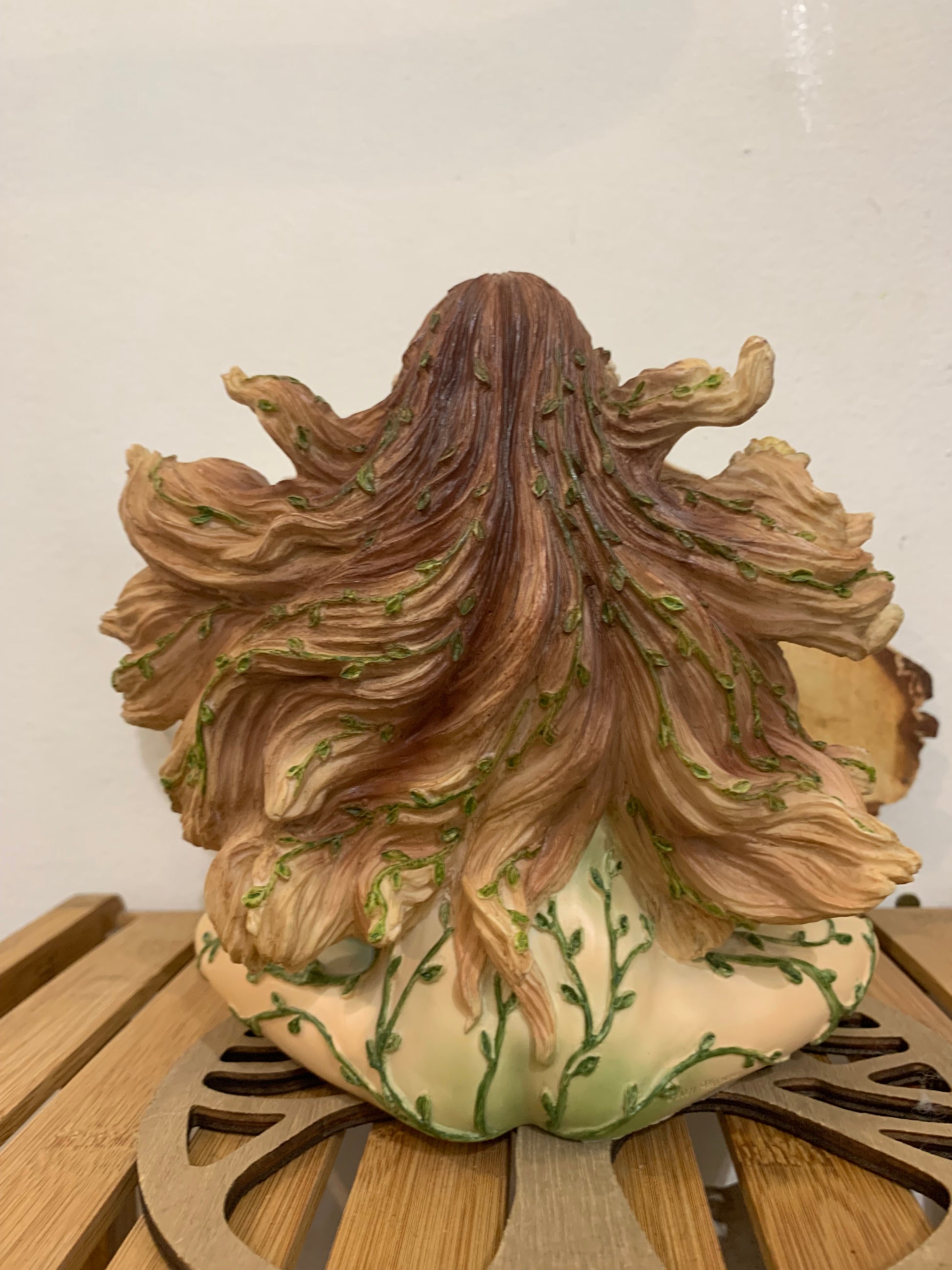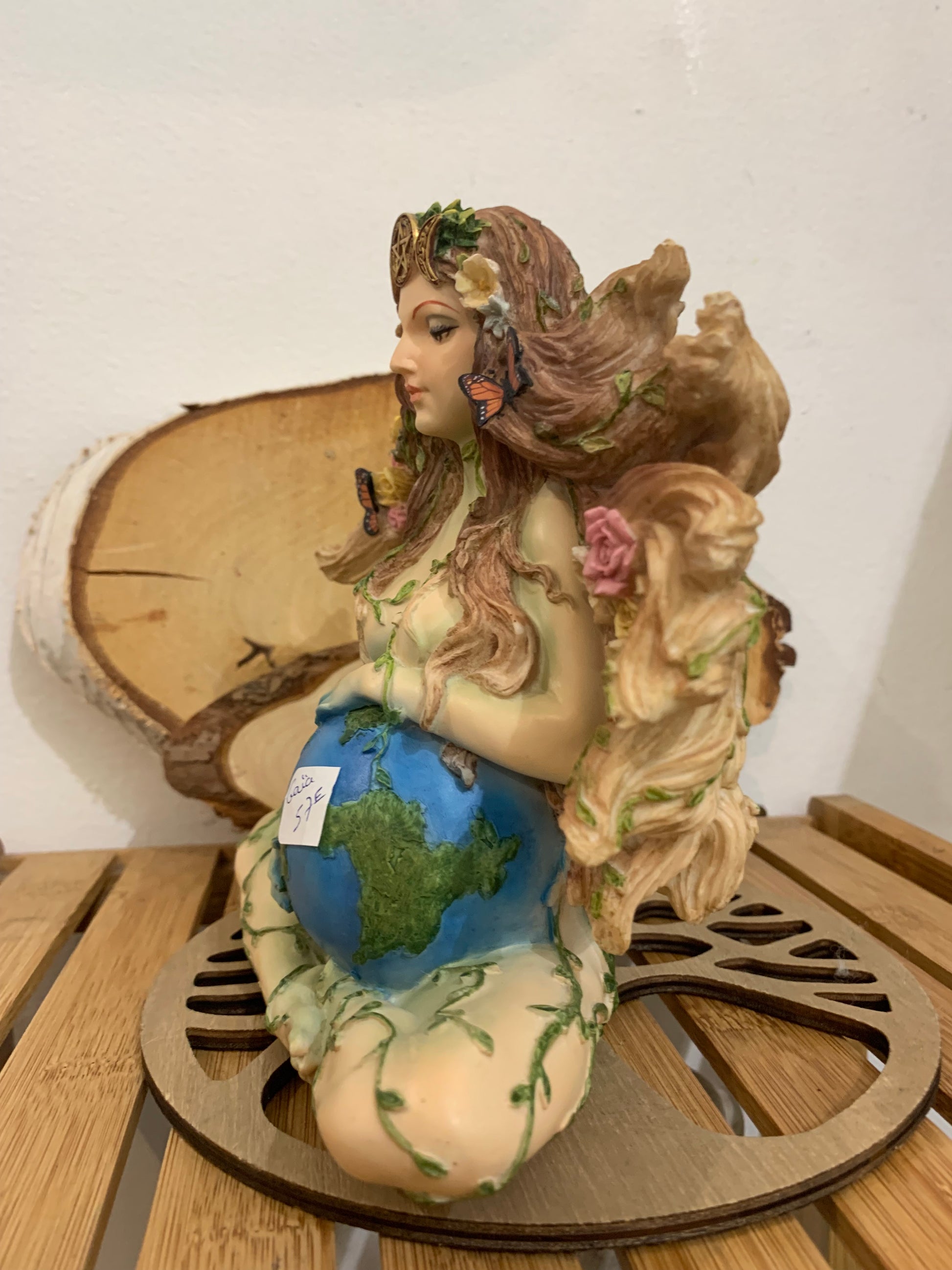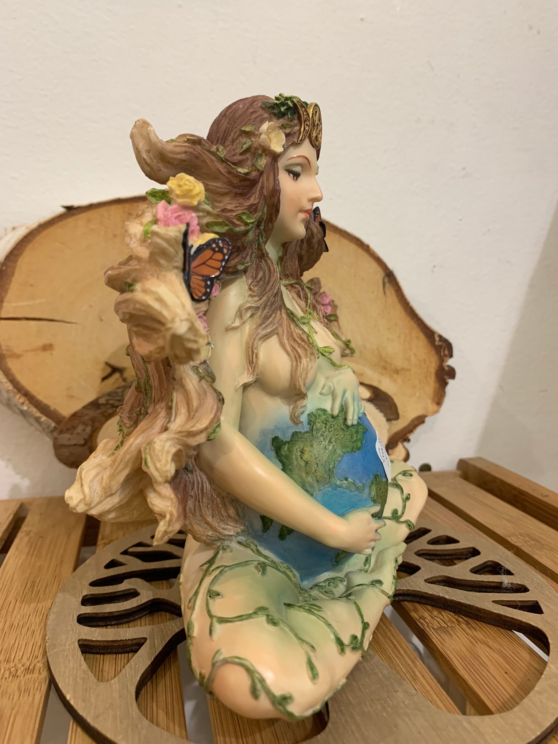 Cette statue représente Gaïa, incarnation sacrée de la Terre vivante, et sa signification spirituelle est profondément liée à la création, à la fécondité et à l’équilibre du monde. Gaïa y apparaît enceinte de la planète, symbolisant la Terre comme matrice universelle : tout naît d’elle, tout y retourne. Le ventre rond évoque la gestation permanente de la vie, la responsabilité collective de protéger ce qui est en devenir, et l’interconnexion entre l’humanité et la nature. Les plantes, fleurs et lianes qui l’entourent représentent la croissance, la régénération et les cycles naturels, tandis que les papillons incarnent la transformation et le passage vers une conscience plus élevée. Sa posture calme et enracinée suggère l’ancrage, la stabilité et la sagesse ancestrale, invitant à se reconnecter au corps, à la Terre et aux rythmes naturels. Spirituellement, cette statue est un symbole puissant de protection, d’abondance et de guérison, rappelant que la Terre est un être vivant sacré, nourricier, et que prendre soin d’elle revient aussi à prendre soin de soi.