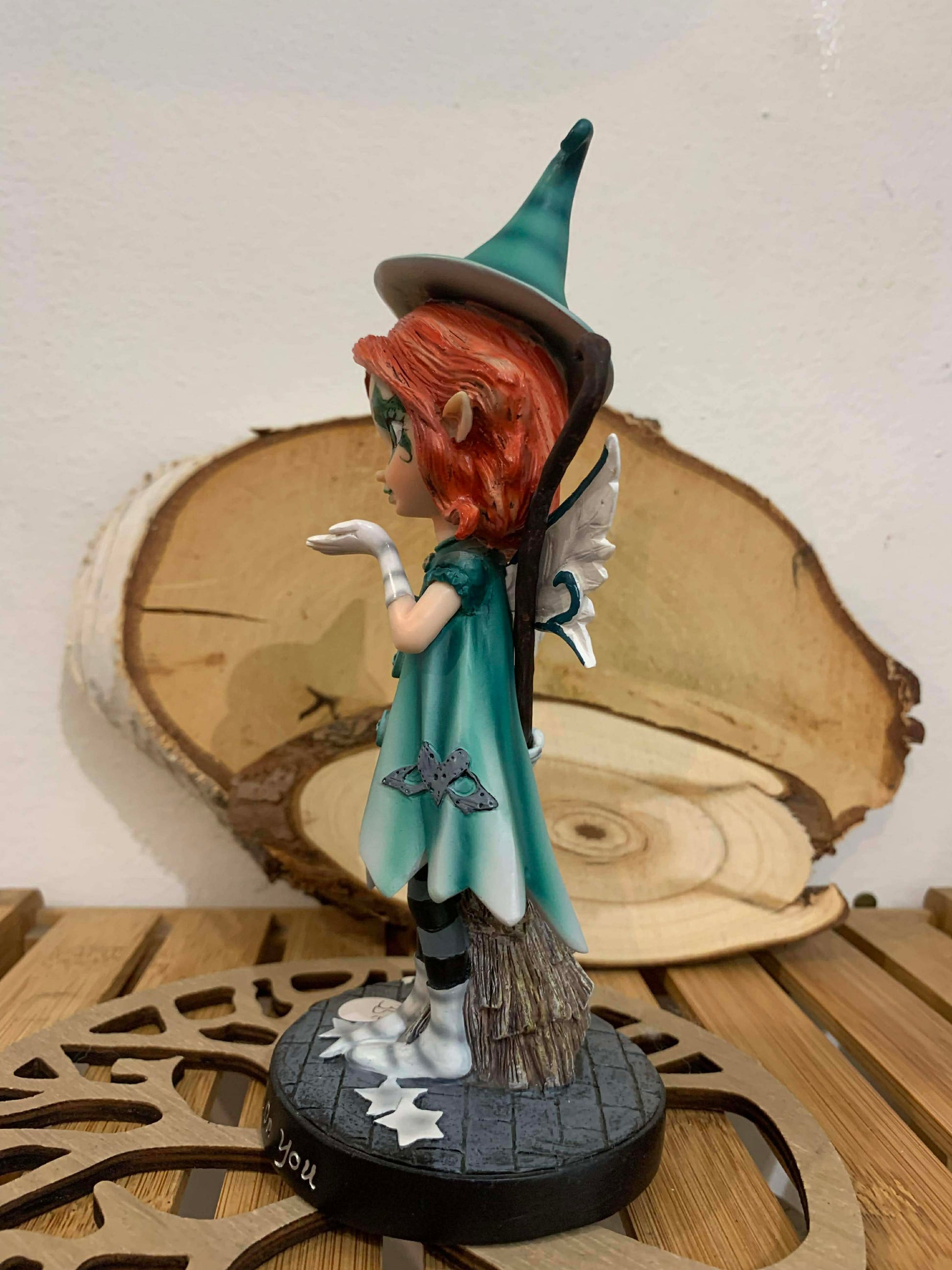 Cette statue de fée porte une symbolique spirituelle riche, mêlant protection, transformation et magie intérieure. La fée représente traditionnellement le lien entre le monde visible et l’invisible : elle est messagère des forces subtiles, de l’intuition et de l’imagination sacrée. Son apparence juvénile évoque l’âme pure, la spontanéité et la capacité à voir la beauté cachée dans les choses simples. La tenue verte renvoie à l’énergie du cœur, à la guérison, à la nature et au renouveau, suggérant un esprit en harmonie avec les cycles naturels. Le chapeau et le balai rappellent la sorcière bienveillante : non pas une figure sombre, mais une initiée, symbole de sagesse féminine, de pouvoir personnel et de transformation intérieure. Le geste de la main levée, associé à l’inscription « I’ll put a spell on you », peut se lire spirituellement comme l’affirmation du pouvoir de l’intention : ce que l’on pense, ressent et affirme influence notre réalité. Les ailes indiquent l’élévation spirituelle, la protection et la capacité à s’affranchir des limites terrestres. Dans son ensemble, cette statue peut être vue comme un talisman invitant à écouter son intuition, à reprendre confiance en sa magie personnelle et à se rappeler que douceur et pouvoir peuvent coexister.
